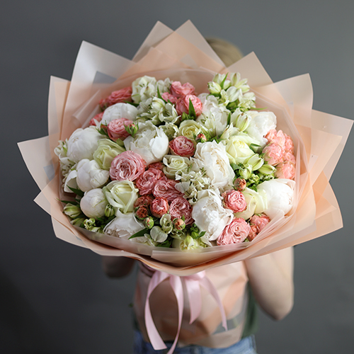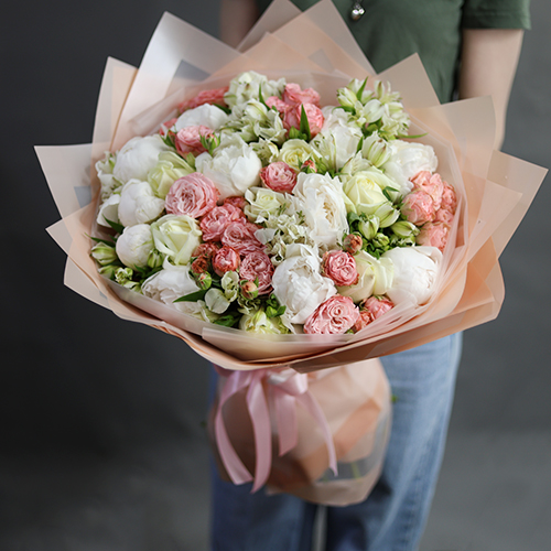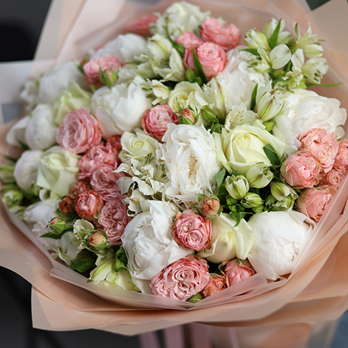 Букет "Лейла" из пионовидных кустовых роз Бомбастик, альстромерий и пионов