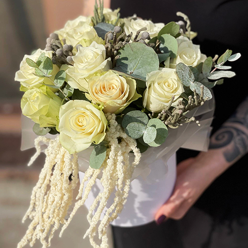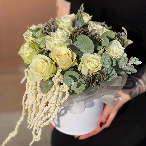 Композиция в шляпной коробке "Чудное мгновение" из 13 роз, эвкалипта, брунии и амарнтуса